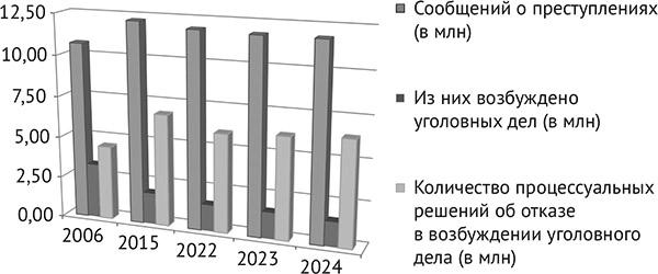 Так, в деятельности правоохранительных органов за 2006–2024 гг. при практически неизменном количестве зарегистрированных сообщений о преступлениях отмечается тенденция роста процессуальных решений об отказе в возбуждении уголовного дела, порядка четверти которых органами прокуратуры ежегодно признаются незаконными или необоснованными и отменяются, что свидетельствует о нарушении прав пострадавших от преступлений лиц на доступ к правосудию и возмещение причиненного ущерба (ст. 52 Конституции Российской Федерации)2.