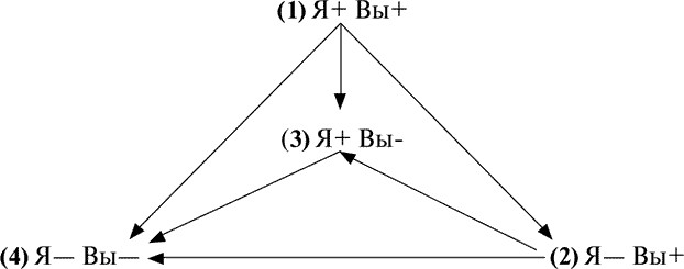 Реакция начинается с первой позиции условного благополучия «Я благополучен – Вы благополучны». Условного потому, что перед стрессом человек чувствовал себя более благополучным, чем в ходе его переживания.