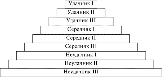 Выделяются три, обозначенных выше, уровня экзистенциальных установок: неудачники, середняки и удачники. В свою очередь, в каждом из уровней можно обнаружить три подуровня (см. рис. 2).