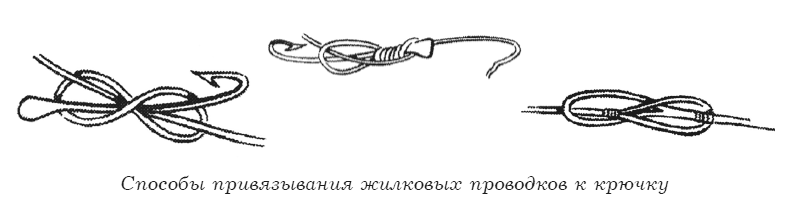 Шелковые поводки, а равно и поводки в несколько конских волос, привязываются так же, как и жилковые, но не подвергаются предварительно ни расплющиванию, ни размачиванию.