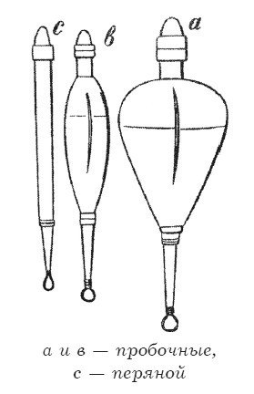 Поплавки делаются из дерева, древесной коры (ивовой, осокоревой, сосновой), пробки, тростника, гусиных и лебединых перьев, колючек дикобраза и т. д.; самые лучшие из них – пробочные поплавки, в тех случаях, когда скорость течения требует более или менее тяжелого грузила, и поплавки из одного гусиного или лебединого пера, когда течение незначительно. Для ловли рыб, клюющих нерешительно, последний род поплавков положительно незаменим.