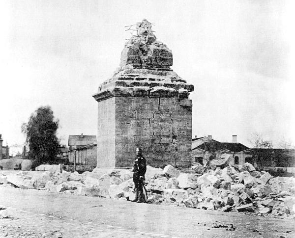 От сильнейшего удара молнии четырехгранная колонна оказалась разрушенной практически вдребезги, почти до самого пьедестала. Жертвой природной стихии оказался городовой петербургской полиции Лука Лобов (знак №458), стоявший на посту у подножия памятника. Он погиб под его обломками.