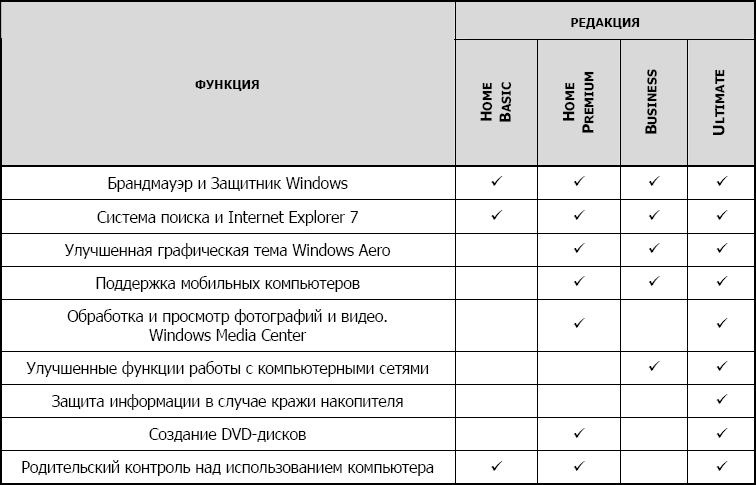 Компания Microsoft продолжает политику деления операционньгх систем на редакции. Windows XP имела две самые распространенные редакции, устанавливаемые на домашние и офисные компьютеры, – Home и Professional, а Windows Vista – четыре (Ultimate, Business, Home Premium, Home Basic). Кроме того, существуют редакции Enterprise и Starter, а также 64-разрядные версии. С одной стороны, такая политика может привести пользователя в замешательство, а с другой – позволяет ему выбрать наиболее оптимальный вариант для работы и/или развлечений.