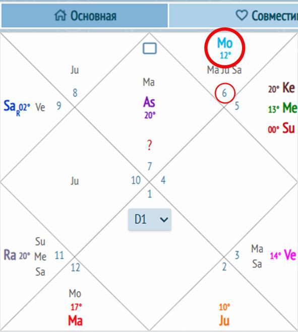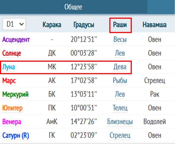 Построив карту, спуститесь до таблицы под натальной картой. В ней найдите Луну и её знак в колонке Раши. Колонка Навамша нас пока не интересует.