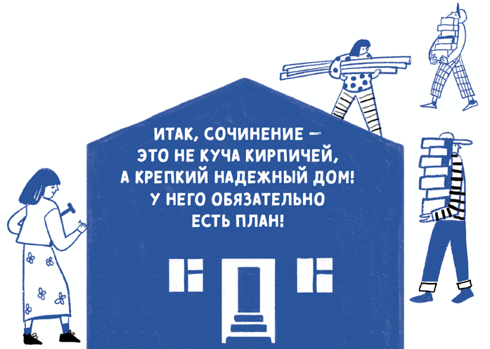 Написание текста можно сравнить и с работой строителя. Много ли ты видел домов, у которых дверь располагается на крыше, а балкон упирается в землю? Станут ли гости карабкаться в дом через окно? Нет, дома строят по строгому архитектурному плану: фундамент, стены, перекрытия… Так же и читатель твоего сочинения (даже если это самая строгая учительница Марья Ивановна) нигде не должен споткнуться или заблудиться. Позаботься о нем, пожалуйста!