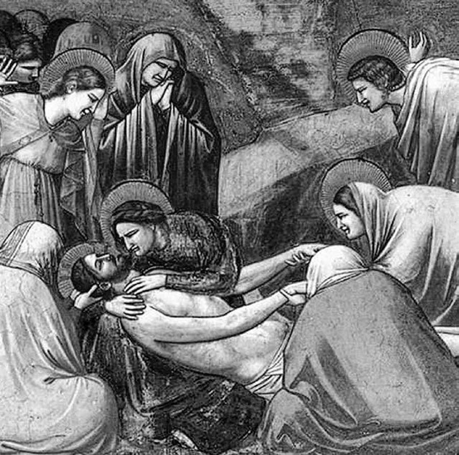 «Положение во гроб» – полуикона, а наполовину уже итальянская живопись. Десяток ангелов, сокрушающихся в небе, их различного стиля полёты – выдают смятение и более десятка фигур, из них семеро – женщины, наклонённые и сидящие над белым телом Христа (опять мы лицезрим две спины на переднем плане – фирменный стиль Джотто).