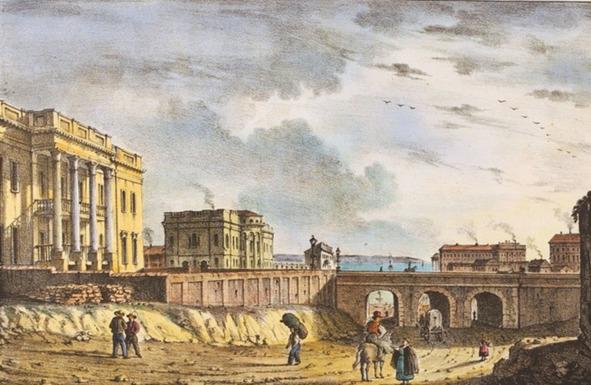 На Пересыпи уже 2 месяца работают 60 человек арестантов; ям уже нет, спуск перемощён заграничным камнем <…> деревянный мост через Молдаванскую большую балку был перестроен заново, с обеих сторон перед ним сделали шоссе и каналы. Биржа и Институт подвигаются плохо по запутанности отчётов <…> набережная, делаемая Потаповым скоро будет окончена. <…> в Военной балке, лежащей близ Вашего дома, оканчивается большой канал для стока вод. <…> Купальню, бывшую под бульваром, намерен я переделать в красивое здание, коего план при сем посылаю. Уверен, что вы его одобрите <…> зная мысли ваши, я ласкаю себя надеждою, что вы, по возвращении вашем к нам и увеличите моё усердие к службе на пользу города здешняго и всего края <…> в балке Жуковского хутора я развожу по обеим сторонам лес. Землю приготовляет Рубо двумя своими плугами; а деревья (до 20000 на первый раз) получу из Слабодзеи. Такую же плантацию начинаю я и в Пересыпи, у самой таможни, но в меньшем виде <…> в ноябре открыли мы здесь Английский клуб и избрали вас членом нашим <…> капитаном порта Потёмкиным, на которого купечество жалуется за взятки, и я весьма им недоволен <…> другая неделя у нас холода, и порт замёрз. Торговля плоха, но Молдавское вино поддерживает город, доставляя значительный доход, нам нужны для больницы хирургические инструменты и прошу вас купить для города»[10]. Конечно, Воронцову все эти сведения были интересны и он приказал временно остановить строительство дворца. На литографии Карла Боссоли видим, тот момент, Столовый корпус готов, за ним видны постройки старого Азиатского павильона. Фундамент под Главный корпус залит, Ново построенная мечеть видна выше по склону. По просьбе Левшина граф за свои деньги позже купил два набора хирургических инструментов и отослал ему в Одессу. Воронцову так же было сообщено, что в конце ноября на Южном берегу Крыма прошёл сильный ураган «что вековые деревья из корня вырвал, многия крыши сорвал, снял крышу и с Массандровской церкви; в Юрзуфском доме перебил почти все окны и сорвал двери даже в отдалённых комнатах. В Севастопольской бухте повредил некоторые суда, а в Таганроге разбросал корабли так, что и по сию пору многие не отыскиваются. Около Евпатории повалил два корабля, в Феодосии выбросил одно судно на берег и разрушил садовые колонны. От сего же ветра Таганрог потерпел на сотни тысяч убытков».