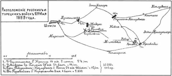 Турки не сидели без действия и визирь Решид-паша, собрав 40 000 армию двинулся на местечко Козлуджа а затем к Праводам, где окружил наш отряд (3000 человек) генерал-майора Павла Купреянова. Пока турки осаждали геройски оборонявшихся солдат Купреянова, барон Дибич, сделав длительный скрытый марш отрезал своими войсками турок от Шумлы.