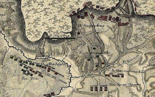 Османы, сняв блокаду города Праводы, двинулись в сторону Шумлы. Подойдя к селу Мадеры донские казаки, повстречав 1500 турок, ударили по ним. Бросив всё, они, сев на коней побежали к своему главному лагерю. Более 300 конников было убито и ранено во время погони, длившейся на протяжении 6 вёрст. Противник выслал из Шумлы 3000 подкрепление и подойдя к речке Буданлык занял позицию. Наши казаки Борисова и Ежова полков совместно с уланами 4 дивизии под командованием генерал-лейтенанта барона Крейца начали форсировать на конях эту речку. Казаки полковника Ежова и уланы Харьковского полка перетащили на плотах 8 пушек. Донские казаки, перейдя речку сразу же ударил по левому флангу турок. Далее переправились основные силы, и противник отступил в Шумлу. Отряд генерал-майора Якова Отрощенко с пехотою и гусарами Иркутского полка пройдя село Мадеры прибыли в район Кулевчи и Черковни. Вышедшие из Силистрии ночью основные наши войска оказались в тылу неприятеля. Генерал от инфантерии Логгин Осипович Рот с батальонами 30 мая разместился левее Главного штаба нашей армии. Турецкая армия (около 5000 бойцов) очутилась в окружении. Турки, не зная расположения наших войск, утром спустились с высокой горы и остановились в версте от деревни Черковни. В центре стояла пехота с 6 орудиями, а по краям конница. Противник передвинул свои войска на правом фланге по высокому берегу. Генерал Отрощенко первым начал палить из пушек по противнику и тот не замедлил ответить. Османские ядра летели через головы наших солдат и ложились позади в долине. Внезапным броском егерей подполковника Севостьянова он выскочил наверх с 2 пушками и оказался на правом фланге турецкой батареи и открыл беглый огонь «турки были поражены неожиданным ударом, оставшиеся в живых и не раненые побежали в лес, оставив свои орудия». Спустя некоторое время подошли основные силы и наши стали отстреливавшись отступать в низину к речке. Удачным выстрелом артиллеристов генерала Ивана Карловича Арнольди (который ранее потерял ногу) был подорван склад зарядных турецких ящиков и произошёл большой взрыв. Затем туда была направлена кавалерия, от которой противник бежал, оставив все пушки. Основные силы генерал- адъютанта Карла Толя пришли в движение и поднялись выше по широкой равнины. Увидев свежие войска турки, не обращая внимания на своих командиров «побежали в горы кучами и поодиночке». «Визирь, не имея резерва, не мог подкрепить рассеянных своих войск, ибо все они пущены были в действие против авангарда, и отступить в порядке также не мог; узкая дорога в тесной дефиле была заставлена, как сказывали, на восемь вёрст обозами. Посему он не мог спасти с места сражения ни артиллерии, ни даже багажа: все досталось в руки победителей»[4].