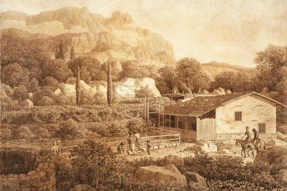 Кебах английский сад перекрыл дорогами <…>. Он посадил 6000 декоративных деревьев на побережье, питомник и 5000 гранатовых деревьев, и все обрисовано как нельзя более совершенно, со вкусом и простотой. Алупка уникальна. Ни один государь не обладает ничем приблизительно подобным <…>, и Кебах рождён, чтобы быть садовником. Если бы император увидел Алупку, какой она стала, он дал бы Кебаху 10000 дублонов, чтобы тот ему сделал Царское Село <…>. Месье граф, этот славный человек имеет всего только 12 работников для двух садов и масличной плантации». Княгиня Голицына на своих землях к тому времени высадила уже 30 000 лоз винограда (бордо, мускат, пино-нуар, траминер, кокур, клебер и другие) и делала вино, которое продавала по всей Малороссии. Анна Сергеевна очень гордилась своим «рислингом» которого она высадила около 4 000 кустов. Гартвис ставил этот сорт выше всех прочих немецких лоз и отзывался о нем весьма высоко: «Великолепный сорт. Самый известный по деланию из него лучших рейнских вин, Иоганнисбергского и других, занимает первое место между сортами столовых вин». Швейцарский архитектор Карл Эшлиман выстроил для княгини специальные подвалы из камня, доставленного из Феодосии. На гравюре К. Кюгельхена видим, какой была татарская деревня Алупка. За домом видны громадные камни малого хауса и основание древней круглой башни. Слева от домика сад-огород, а на плоской крыше другого целая татарская семья.
