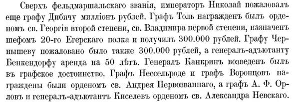 Все наши офицеры получили различные награды: генерал Красовский получил орден «Святого Владимира» 1 степени, Берг и Шильдер ордена «Св. Георгия» 3 класса, инженер-полковник Капель и Сорокин получили ордена «Святого Владимира» 3 степени.