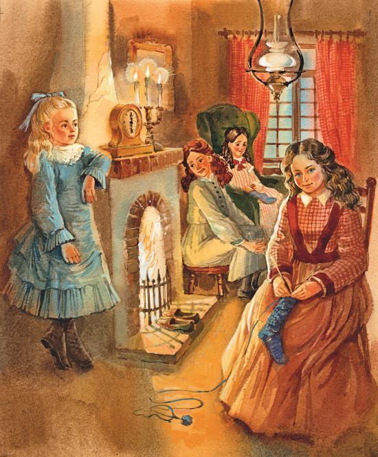 Всем юным читателям нравится представлять себе, «как люди выглядят», так что воспользуемся моментом затишья и опишем, хотя бы вкратце, четырёх сестёр, сидящих в ранних сумерках за вязаньем, ни на миг его не прерывая, тогда как снаружи, за окном, тихо падает декабрьский снег, а внутри, в комнате, весело потрескивает огонь в камине. Комната удобная и приятная, хотя ковёр уже выцвел, а мебель очень проста; однако стены украшают две-три хорошие картины, нишу заполняют полки с книгами, а на окнах цветут хризантемы и красные рождественские розы; здесь царит приятная атмосфера домашнего покоя и уюта.