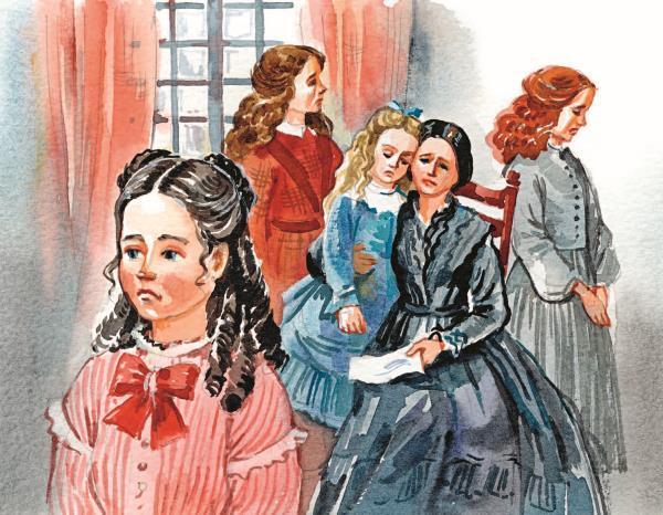 Маргарет – то есть Мег, старшей из сестёр, – уже исполнилось шестнадцать. Она очень хороша – пухленькая и беленькая, большеглазая, с прекрасными светло-каштановыми волосами, с нежным ртом и очень белыми руками, которыми она даже немножко гордится. Пятнадцатилетняя Джо отличается высоким ростом и худобой. Она смугла и напоминает жеребёнка: кажется, что она никогда толком не знает, куда девать свои длинные ноги и руки, которые ей вечно мешают. Линия рта у неё решительная, нос – смешной, а серые глаза смотрят пронзительно и, как представляется, видят абсолютно всё, и взгляд их бывает то яростным, то весёлым, а то задумчивым. Единственной красою Джо надо назвать длинные, густые каштановые волосы, но она всегда небрежно заталкивает их в сетку, чтобы не мешали и никому не попадались на глаза. Джо сутулится, кисти рук и ступни у неё крупные, одежда на ней свободно болтается, и выглядит бедняжка неловкой, неуклюжей, как обычно выглядит девушка, слишком быстро превращающаяся во взрослую женщину и весьма этим недовольная. Элизабет, то есть Бет, как все её называют, – розовощёкая, гладко причёсанная, ясноглазая девочка тринадцати лет, застенчивая, с тихим голоском и умиротворенным выражением лица, почти никогда не нарушаемым. Отец называл Бет «маленькая Мисс Спокойствие», и это имя отлично ей подходило, потому что девочка, казалось, живёт в своём собственном, полном счастья мирке, из которого решается выйти навстречу только тем, кому верит, тем, кого любит. Эми, хотя и самая младшая из сестёр, считается в семье – во всяком случае, по её собственному мнению – особой самой важной. Настоящая снегурочка – голубоглазая, с золотистыми волосами, волнами спадающими ей на плечи, бледнокожая и изящная, она всегда держит себя как юная леди, не забывающая о хороших манерах.