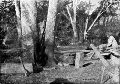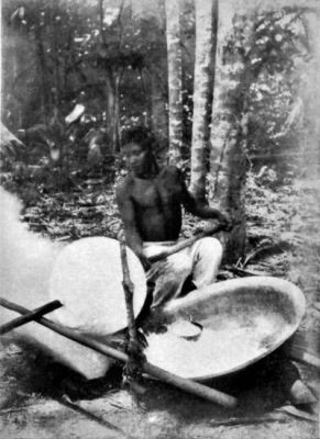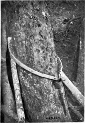 It is seldom one could find a man with a more unpractical mind. He spent most of his energy working uselessly—and, mind you, very hard indeed—for nothing, but he could never be made to apply his strength in a sensible way. If I asked him to cut me a tooth-pick, he would proceed to cut down one of the largest trees in the neighbourhood and work for an hour or two until he had reduced a big section of it into the needed article. He wasted hours daily, and ruined all our axes and cutlery into the bargain, in scraping flat surfaces on rocks and on the hardest trees, on which he subsequently engraved his name and that of his lady-love whom he had left behind. He was really marvellous at calligraphy, and could certainly write the best hand of any man I have ever known.