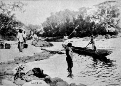 We had nothing to eat in the evening. In the morning our breakfast consisted of two sardines each. We went on in a half-hearted way, my men grumbling all the time, and looking out for birds or monkeys. Seven thousand five hundred metres from our camp we came to a waterfall, where we had endless trouble. The principal channel led to 50° b.m., but the river split up into innumerable channels among islands, islets and rocks that formed a regular maze. The river was in that particular spot 1,200 m. wide, and contained great masses of volcanic rock, much fissured, and having great holes in them. This mass of rock extended from north-east to south-west. There were large cracks, where the mass had split, and had subsequently been eroded by the rush of water. The rock had cutting edges everywhere like those of razors. With endless difficulty we had managed to drag the canoe along nearly to the bottom of that dangerous place, when we were suddenly confronted by a drop of 12 ft. with a terrific rush of water over it. It was impossible for us to negotiate that point, for below was a whirlpool absolutely impassable. We had therefore the tiresome work of dragging back the canoe for some 350 m. up the rapid once more, in order that we might find a more suitable channel. To make things more lively for us, a violent thunderstorm broke out, soaking all our baggage but making little difference to us, as we were soaked already. We had spent that entire day in the water, struggling to take the canoe down the rapid and up once more. By eight o'clock at night we were still working, endeavouring to save the canoe.