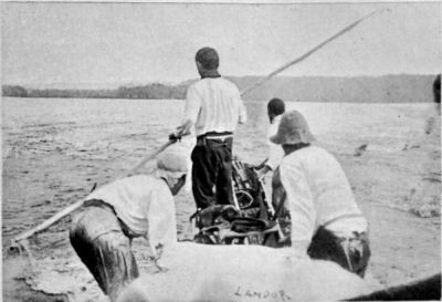 We cut down some long poles, and I placed one man with a big pole on guard at each corner close to the water, in order to push the canoe away toward the middle of the stream in case she came too near those dangerous points.