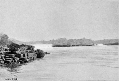 We had halted just above another big and beautiful waterfall, 20 ft. high, and of immense width. The great rush of water curled over a gigantic dome of volcanic rock with many big holes and fissures. The waterfall was followed by a ghastly rapid 500 m. long. It was impossible to go over the fall, and the only way left us—a most dangerous one—was to let the canoe down a small channel 50 to 80 m. wide, cut among the vertical rocks on the right side of the waterfall. The water in the channel flowed in steeply sloping cascades. The channel twisted round abruptly in two or three places, and in one spot went through a rocky neck 35 m. wide, where the force of the current was so great that I was really perplexed as to how we could take the canoe down without getting her smashed to atoms.