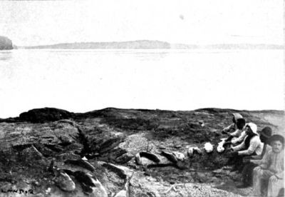 After a race of great excitement, we all, with bleeding feet and hands—the palms of our hands actually blistered by the rope which slid through our tightly closed fists—were eventually able to pull the canoe safely on shore below the rapid.