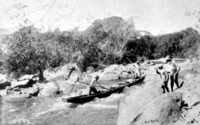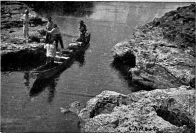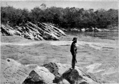 It does not do ever to lose courage. While my men, in the lowest state of depression, sat on the volcanic rocks, I went about exploring on the right bank until I found a place where the river had eroded a channel but had afterwards filled it with an immense accumulation of rocks. If we could only move those rocks away—several hundreds of them—I saw that it would be possible to push the canoe along the channel which would thus be formed. The work would require a great deal of hard labour.