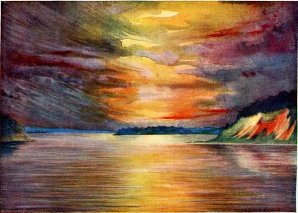 We had had no lunch, and now had no dinner. My men felt perfectly miserable, and in their speech did not exactly bless the day they had started with me on that expedition. We had worked hard, and had only covered a distance of 7,500 m. in twelve hours. At sunset, while the storm was raging, we beheld a most wonderful effect of light to the west, very much like a gorgeous aurora borealis. The sky, of intense vermilion, was streaked with beautiful radiations of the brightest lemon-yellow, which showed out vividly against the heavy black clouds directly above our heads. The river reflected the red tints, so that we appeared to be working in a river of blood.