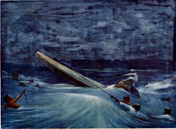 In the meantime the canoe had swung with great vigour and struck the big rock sideways, smashing her side and filling at once with water. All the baggage was swamped; only a portion of the canoe aft remained above the water, many of our things being washed away altogether.