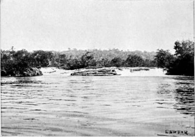 We had the greatest difficulty in approaching this, owing to the strong current we encountered in a small channel we followed near the right bank. The rapid was 400 m. wide and 400 m. long, with a drop of from 4 to 5 ft. Although we expected trouble at that spot, we shot the rapid with comparative ease, but we were badly knocked about, and shipped a considerable amount of water in the high waves thrown violently against the rocks. We camped that night near the rapid, having travelled in the day 26 kil. We made our camp in the forest, and we experienced stifling heat, the minimum temperature (August 9th) being 73° F., with heavy rain which came down upon us through the foliage in regular bucketfuls.