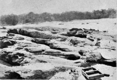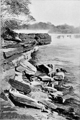 After that, strong eddies were again experienced at first, but, for some 3,000 m. beyond, the water looked beautiful and as placid as possible. The river was now flowing mostly in a northerly direction or with slight deviations, chiefly to the east. We came to a most wonderful island with a spur of lava on its southern side, in the shape of a dome, and highly glazed. On each side of that island was a waterfall of some beauty. The eastern channel was only 20 m. wide, and the water fell over a wall of rock some 12 ft. high. Where this wall projected above the foaming water the shiny black carbonized rock showed a number of small grottoes in its horizontal strata, and a number of funnels like volcanic vents. The north-westerly and broader channel had three successive rapids, the central one some 10½ ft. high, with a terrific current rushing over it, and awe-inspiring whirlpools between the successive rapids.