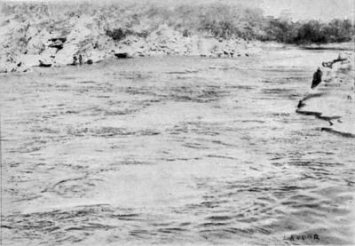 Within ten minutes we had shot two powerful rapids, and in one place went over a dangerous submerged wall of rock extending across the river from E.S.E. to W.N.W.