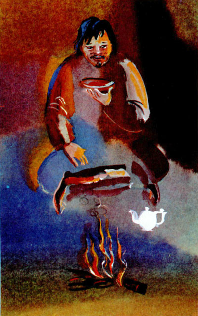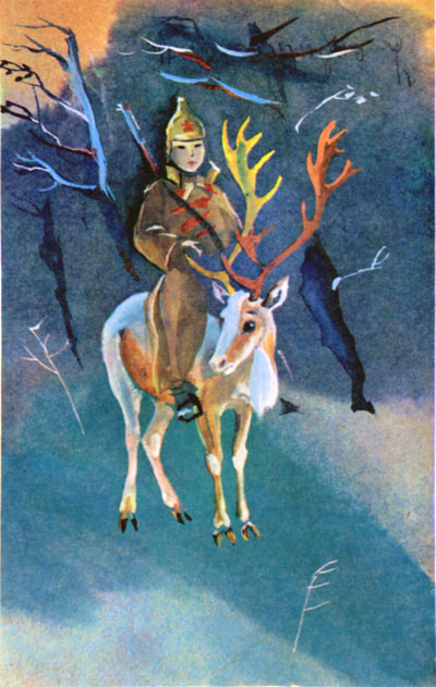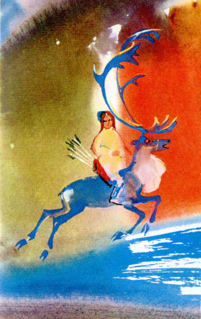 Вдруг небо загорелось, и над тайгой красный олень пронесся. Опустился он возле чумов. С оленя сошел человек. Такого человека эвенки в тайге никогда не встречали. Подходит он к эвенкам, глаза щурит и светло улыбается: