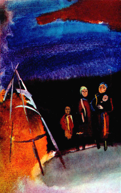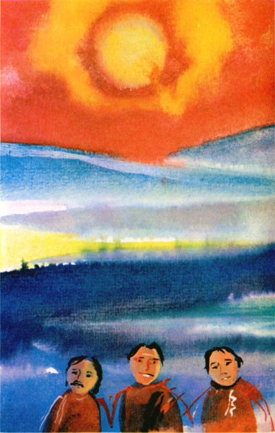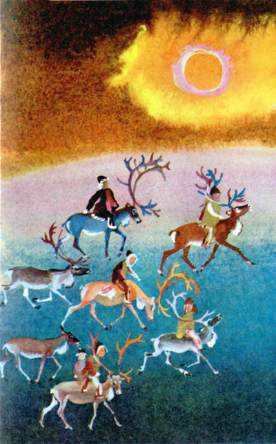 В это время черная туча закрыла солнце. Потускнело солнце. Опечалилось. Ушли эвенки.