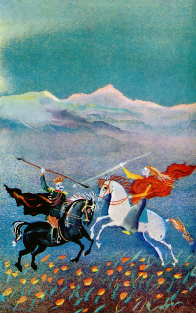 Сошлись Правда с Кривдой, и началась между ними борьба страшная. Хотя с Кривдой народ нечестный пошел, но много и его собралось, а у Правды поначалу все же меньше было, но духу больше они имели. Сколько ночей и дней дрались Правда с Кривдой, никто не подсчитал, кровь от ран рекой текла, мертвые горой лежали, а живые злее становились. Никто не мог осилить Правду, вместо одного потерянного десять человек к Правде шли, зато Кривда таяла, как лед весной.