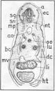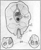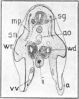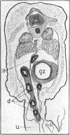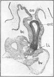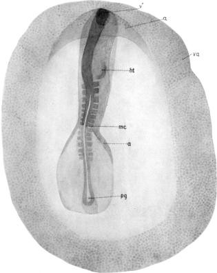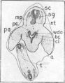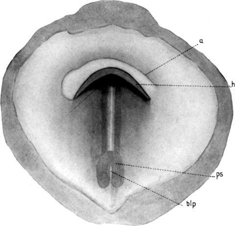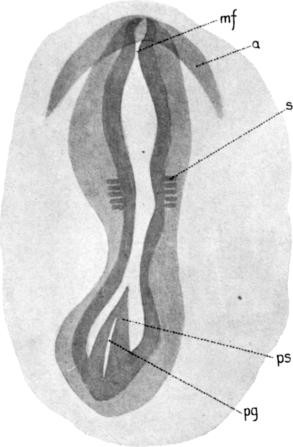 From the stomach the duodenum, d, extends, following a sort of V-shaped course, towards the yolk-stalk, ys. In the region of the yolk-stalk it is somewhat enlarged and ends in a blind sac like a caecum. At the side of this sac is seen the opening of the enteron to the yolk-stalk; the anterior and posterior intestinal portals are not distinguishable from each other. From this point the hindgut, hg, extends cephalad until it lies laterad to the middle region of the duodenum, then bends through 180° and extends, in an almost straight line, to the cloaca, cl, lying in the region of the posterior appendage, pa.