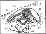 Figure 4G is about fifty-five sections caudad to the preceding figure, and passes through the middle region of the heart, ht. The enteron, ent, is cut caudad to the last gill cleft, but it is nearly as large as in the pharyngeal region described above; its walls are of a more even thickness than in the more anterior sections, though there is an area, just below the aorta, where the wall is still but one cell thick. In the ventral wall of this part of the enteron, and, to some extent, in the lateral walls, there seems to be a tendency for the nuclei to become collected toward the side of the wall away from the digestive cavity; this condition cannot be well seen in the figure owing to the amount of reduction in reproduction.