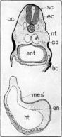 A transverse section through the headfold of this stage is shown in figure 2B. The foregut is seen as a wide cavity, ent, depressed dorsally, apparently, by the formation of the medullary groove and the notochord; it is wider laterally than in a dorso-ventral direction, and its walls are made up of about three layers of closely arranged, irregular cells; the wall is somewhat thinner on the dorsal side, just below the notochord.