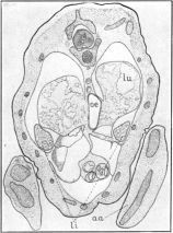 Filling the greater part of the body cavity, below the oesophagus and lung rudiments, is the liver, li; and ventrad to the liver the section passes through a loop of the duodenum, d.