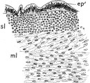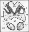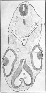 Figure 6B represents a typical section through the pharynx. Its plane is approximately shown by the line 400 of figure 6A though the plane apparently does not cut the eye, e. The pharynx, ph, has here the outline of an irregular V. Its walls, except at the outer angles of the clefts, g1, are composed of but a single layer of cells. In the dorsal wall these cells are flattened, while in the ventral wall they are more rounded. This difference in the shape of the cells accounts for the slightly greater thickness of the floor over that of the roof of the pharynx. The gill clefts no longer communicate with the exterior.