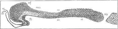 A sagittal section of approximately this stage, shown in figure 1A, represents the foregut, fg, as a shallow enclosure of the anterior region of the entoderm, while the wide blastopore, blp, connects the region of the hindgut with the exterior. No sign of a tail fold being present, there is, of course, no real hindgut. The entoderm, which has the appearance of being thickened because of the fact that the notochord has not yet completely separated from it, is continuous, through the blastopore, with the ectoderm. Posterior to the blastopore the primitive streak, ps, is seen as a collection of scattered cells between the ectoderm and the entoderm, apparently formed by proliferation from the ventral side of the ectoderm.