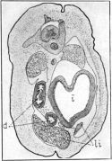 At about the position of the line ta the trachea divides into the two bronchi (only one shown in the figure), which are somewhat enlarged at the ends to form the lung rudiments, lu. While the trachea and bronchi lie ventrad to the oesophagus, the lungs lie laterad and even dorsad to the oesophagus and cardiac end of the stomach. Caudad to the heart and in the region of the anterior appendages, aa, the oesophagus suddenly enlarges to form the stomach, i´, which has now quite the outline of the typical human stomach.