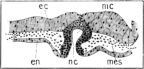 Figure 3A is a transverse section through this embryo near the anterior end of the enteron, ent, which cavity, cephalad to this region, is bluntly pointed. As seen in the figure the enteron is here wide from side to side, and is depressed dorso-ventrally except for a wide groove in the ventral wall. This groove is lined with rather more closely arranged cells, and marks the region where the mouth will break through at a somewhat later stage. A short distance caudad to this region the groove disappears and the pharynx is reduced to a shallow slit extending almost to the superficial ectoderm on either side; then the slit-like pharynx becomes suddenly reduced in a lateral and increased in a dorso-ventral direction, to assume the outline shown in figures 3B and 3C. At a point about one-third of the length of the embryo from the tip of the head, the enteron opens to the yolk-sac, so that what now may be called the foregut has this considerable extent. There is, however, not the slightest indication of a tail-fold, so that there is no inclosed hindgut at all. As is shown in figure 3D, the neurenteric canal, nc, still opens ventrally, though the medullary canal, mc, has now no dorsal opening to the exterior. The medullary canal continues for a short distance (about fifteen sections of five microns thickness) posterior to the opening of the neurenteric canal.