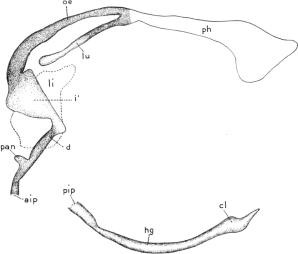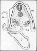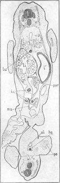 The relative size of the pharynx, ph, as seen in the figure, is smaller than it is in reality because of the small dorso-ventral diameter (the only one here shown) compared to the lateral diameter. The end of the lung rudiment, lu, is slightly enlarged and lies in a plane nearer to the observer than that of the oesophagus, oe, though this is not well shown in the figure.