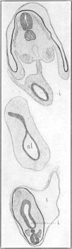 The allantois, al, extends cephalad for some distance from the floor of the cloaca. Some distance caudad to the cloaca, near the end of the much coiled tail, is seen the post-anal gut, pag. This structure as has been noted above, is quite distinct from the other parts of the enteron. It is of elongated, pyriform outline, with the pointed end extending cephalad.