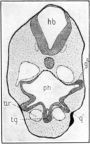 Figure 6C represents the caudal half of the embryo in the plane 475 of figure 6A. The section of the pharynx, ph, is here crescentic in outline, and the pharyngeal walls, especially the floor, are somewhat thicker than in the more anterior section just described. Lying a short distance dorsad to the pharynx are seen two small, thick-walled openings, ty; these are the rudiments of the thymus glands. They are here quite distinct from the enteron, and may be traced through a large number of sections, being in some regions solid and of a smaller diameter than in the present section.