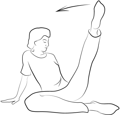 5) Сидим на полу, ноги в коленях согнуты. Поднимаем левую ногу вверх, одновременно отрываем от пола бедро. Не опуская ногу вниз, тянем ее вправо, потом снова вверх и опускаем. Повторяем и с правой ногой.