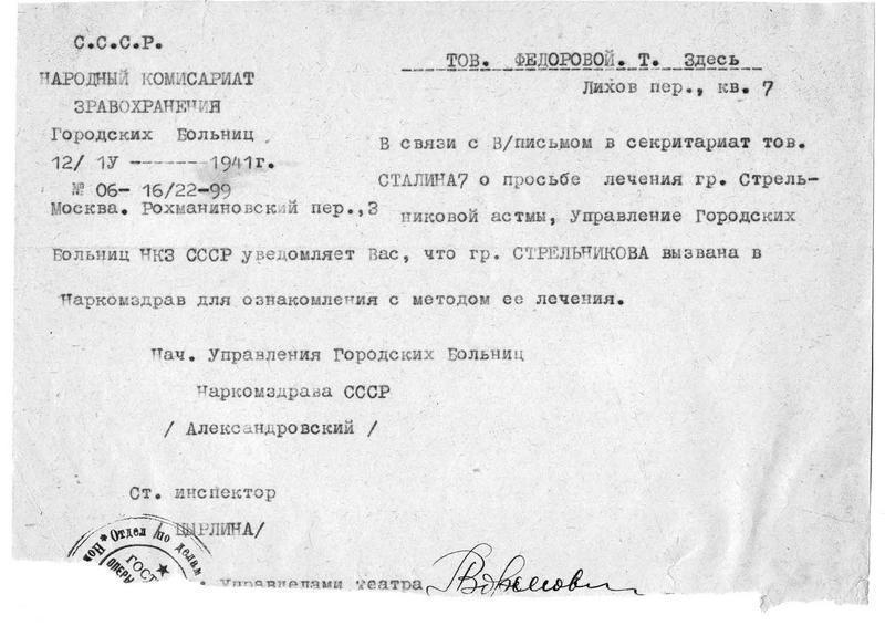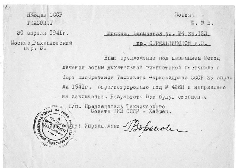 Просматривая старые бумаги Александры Николаевны, я обнаружил документ из Народного Комиссариата Здравоохранения, присланный на имя A. C. Стрельниковой, в котором говорилось: «Ваше предложение под названием «Метод лечения астмы дыхательной гимнастикой» поступило в бюро изобретений Техсовета Наркомздрава СССР 29 апреля 1941 года, зарегистрировано под N 4268 и направлено на заключение. Результаты Вам будут сообщены».