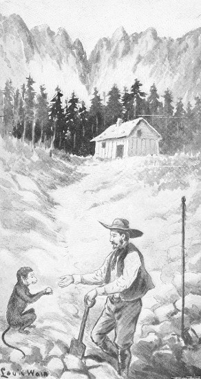 After a long journey over the mountains Donald reached his log cabin on the Silver Creek. The monkey, however, did not find quite so immediate a welcome as himself from Donald's wife. The only pet her children had ever seen before was a baby puma, which the miner had picked out of the stream one day in a half-drowned state. Donald had mistaken it for a kitten of some new brand, and it was not until some weeks later, when it sprang upon his little girl and buried his claws in her neck, that he realised what sort of plaything—the puma is the lion of the Rocky Mountains—he had introduced into his family. So Donald's wife was suspicious of pets, and when she saw the monkey she was sure it was another lion, and would not allow it to enter the door. But Gum had other ways of entering houses than by doors, and finally he was received as a lawful member of the family, for the simple reason that he could not be kept out. The new guest gave little trouble. Most of the day the monkey spent with Donald at the mine. He went off with him when he went to work in the morning, and gambolled round him till he came home for supper. And very soon an incident happened which more than reconciled Donald's wife to her strange visitor. Donald's gold-mine was a poor one. He had to work very hard to get enough of the precious dust to keep his family in food, but his spirits were kept up by the constant hope that he would strike a richer bed and make his fortune. The way he got the gold was to take the sand and gravel from the banks of the river and wash it about in a pan till all the lighter particles passed off with the water, leaving the little spangles of gold at the bottom. Sometimes a week would pass without the miner getting more than a thimbleful, but occasionally he would find a few lumps as big as a pea. One day, however, just as Donald was getting discouraged, a piece of great good-luck befell him. He had been particularly depressed that day, for no gold at all had rewarded his search for a week, and the family were already in debt for flour and clothes. But, thanks to the monkey, he was able to go home to his wife with the largest gold nugget that had been seen in that valley for many years. Gum had been skirmishing about as usual on the gravel heaps, when some loose pebbles were dislodged by his paws, and, as they rolled down, he must have been attracted by the yellow glitter in one large lump, for the next moment he had picked up the nugget and laid it, with a wag of his tail, at Donald's feet. The miner almost wept for gladness, and, taking Gum up in his arms as if he were a child, hurried home to proclaim his fortune. That night the family had a great feast, and Gum's health was drunk in the strongest tea the mining camp could furnish. Perhaps if they had known what was shortly to happen they would not have slept quite so soundly.