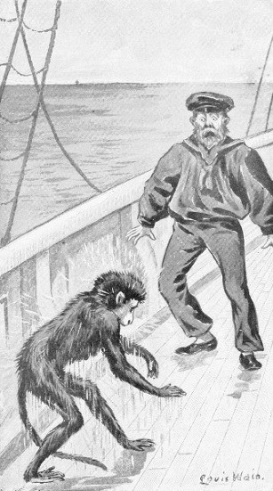 When the boatswain descended upon the deck he was greeted with a sudden deluge of rain. It was only Tricky shaking the salt-water off. The monkey had climbed up the stern rope, and reached the deck before him. What would have happened next is hard to predict, but at this point the Captain, attracted by the scream of laughter which greeted the drenching of the boatswain, came up and was told the sequel to the hanging. Now the Captain was a blunt, good-natured man, and he avowed that neither man nor monkey who had ever been hanged on board his ship should ever be put to death again. This was the law on shore, he said, and he would see fair-play. So Tricky received another lease of life, and thus the ship Vulcan was kept in hot water for two months more.