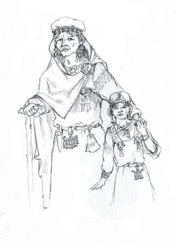 А вот и обитатели тех давних домов, — меряне привиделись в нарядах уходящего лета. Мужчины в шерстяных да льняных рубахах. У пояса нож, огниво, кремень. Женщины в длинных шерстяных да льняных рубахах, подпоясанные кожаными да полотняными поясками. На голове каждой ремешок с прилаженными височными кольцами, на плече, подвешенный, в виде конька или уточки оберег. У особо нарядных на шее ожерелье из бус, монет, на груди бронзовые подвески, у пояса подвески, гребень, нож…