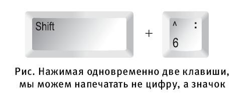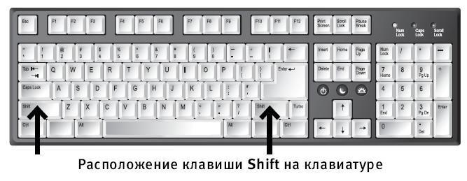 Эта клавиша делает букву заглавной (большой) и помогает печатать то, что размещено на кнопках с несколькими символами в верхней строке, например на кнопках с цифрами (об этом чуть ниже).