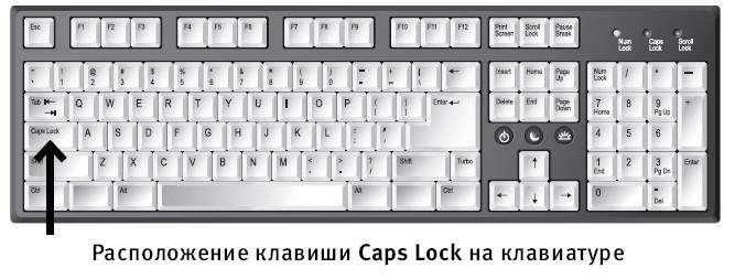 Клавиша Сaps Lock (капс лок) расположена слева над клавишей Shift. Если ее нажать, то все буквы, которые вы будете печатать, будут прописными (большими).