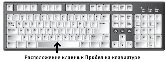 Большая длинная клавиша-линейка внизу по центру помогает создать пробел в тексте. Каждое нажатие клавиши – одинарный пробел, два раза нажмете – получите двойной пробел, три раза – тройной и т. д.